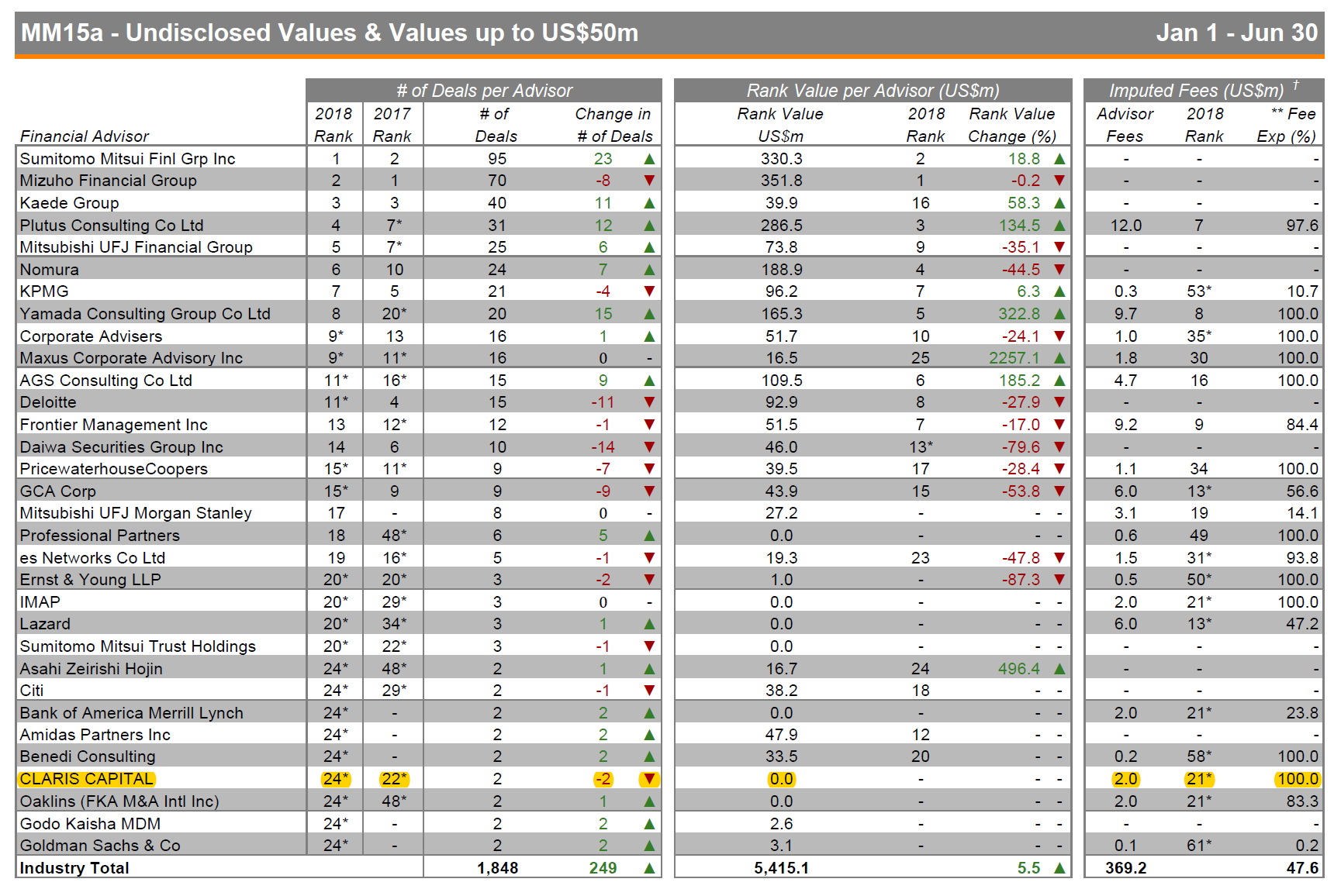 このたび、クラリスキャピタルはトムソン・ロイターが発表した2018年上半期の『Small-Cap M&A Review Financial Advisors First Half 2018』におきまして、